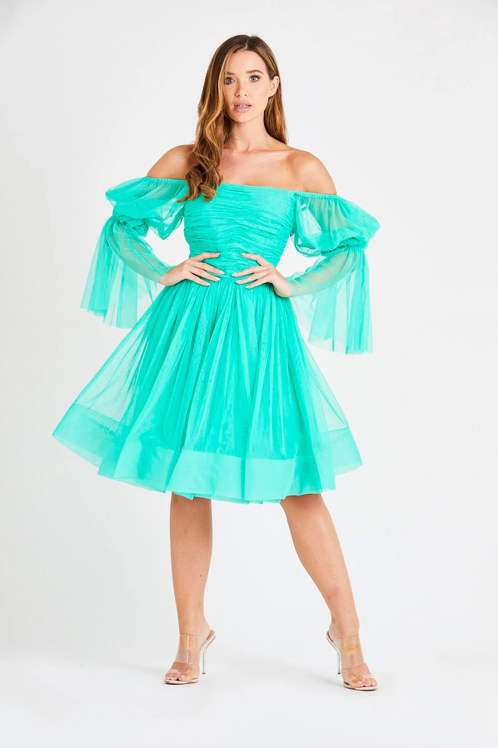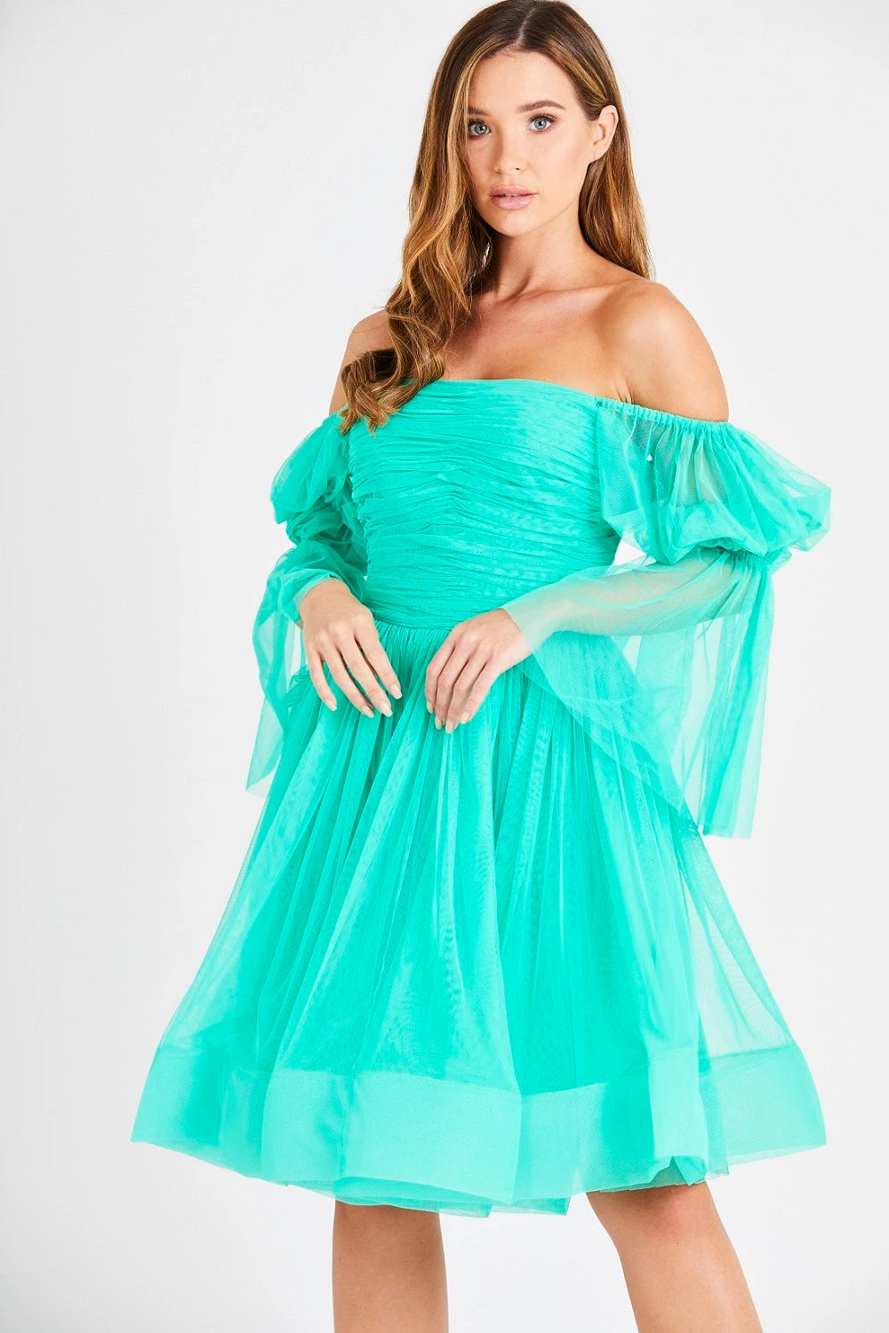 Lace & Beads Amora green tulle dress. This bright green dress features bardot sleeves, a ruches top for a flattering fit, and an a-line tulle skirt. Make an entrance with this green mesh dress.