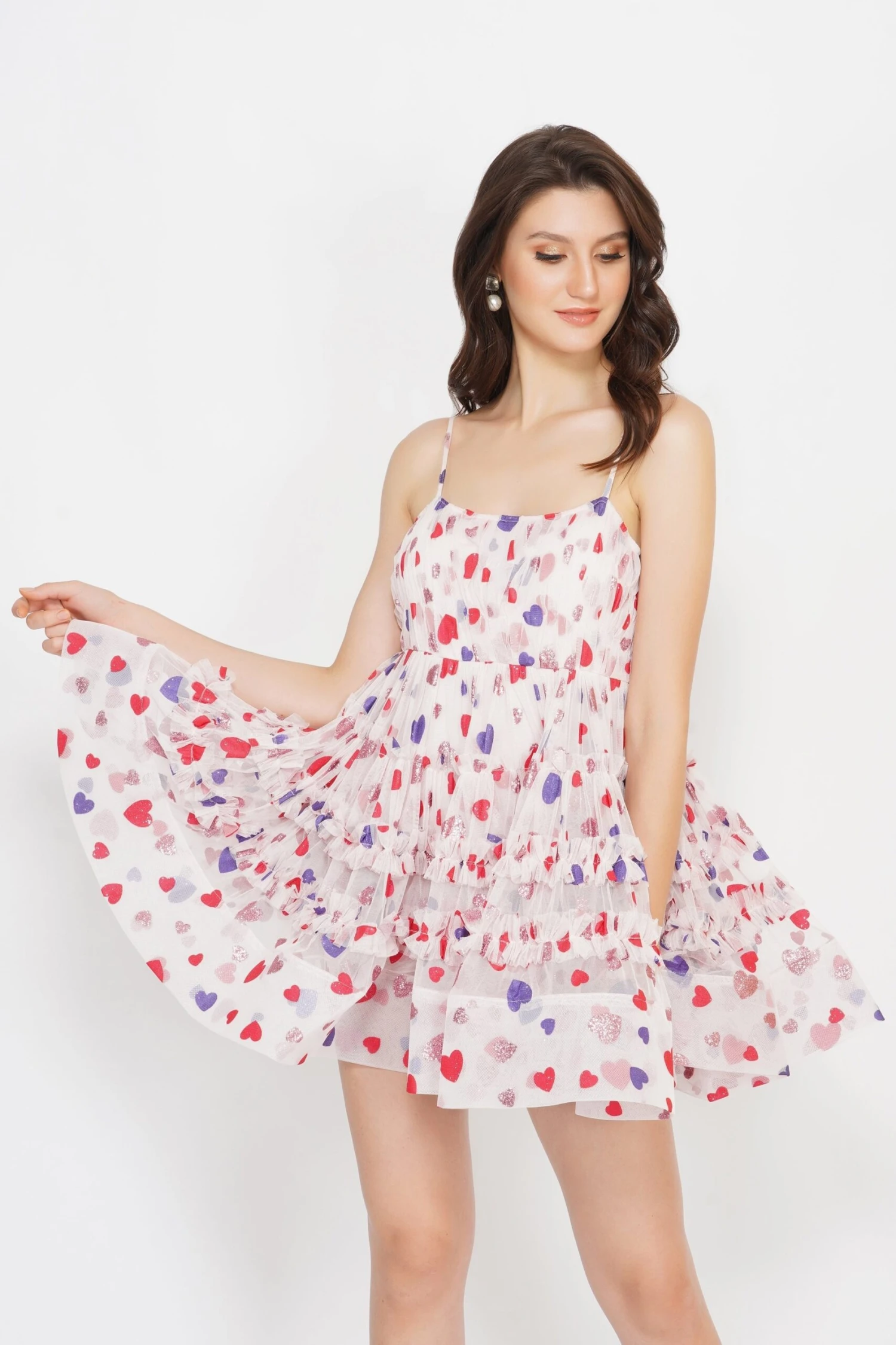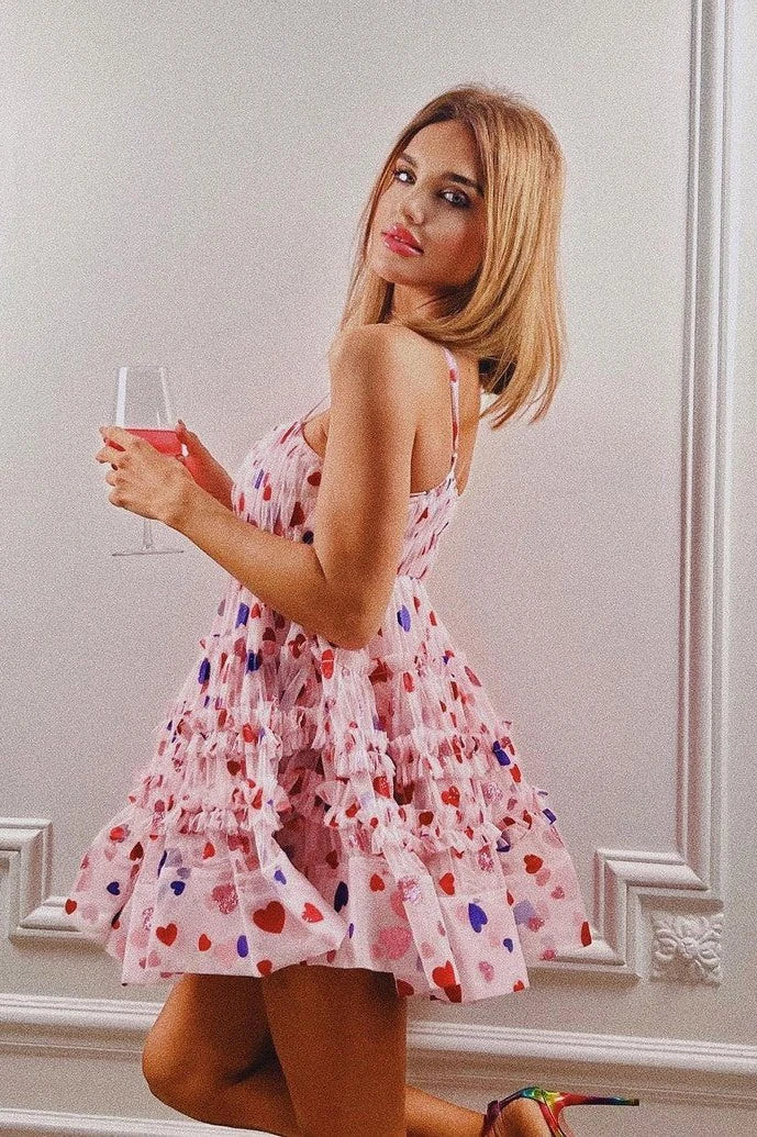 Lace & Beads Bethan glitter rainbow heart mini dress. A structured tulle mini dress with a built-in bodysuit featuring glitter hearts design throughout the dress. A fairytale mini dress in a tutu shape featuring adjustable cami straps, a square neckline, and gorgeous ruffle detailing. Add this heart mini dress to your wardrobe now! This gorgeous trending dress is an absolutely must-HAVE if you are looking for a cute new dress to make an entrance at your next event.