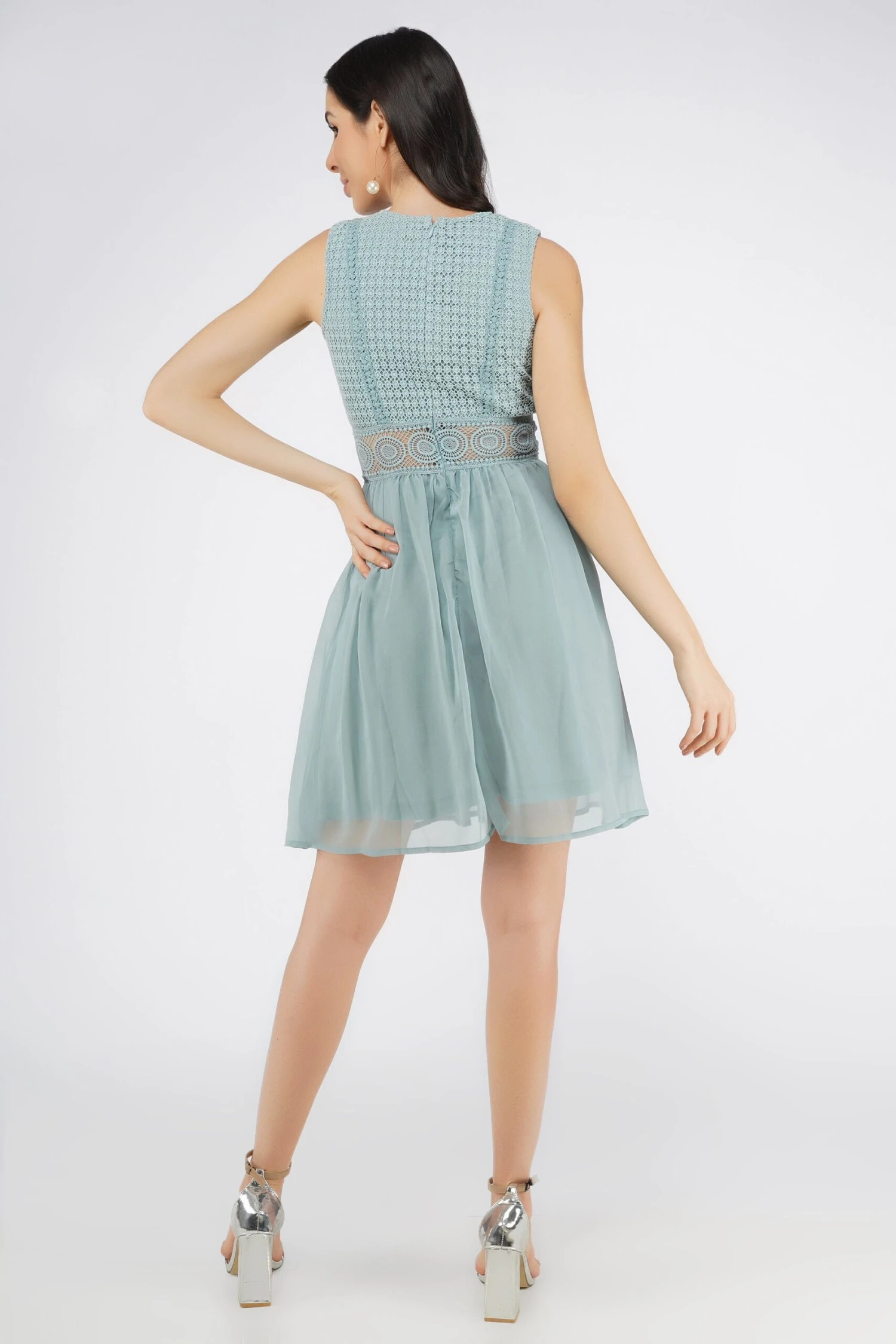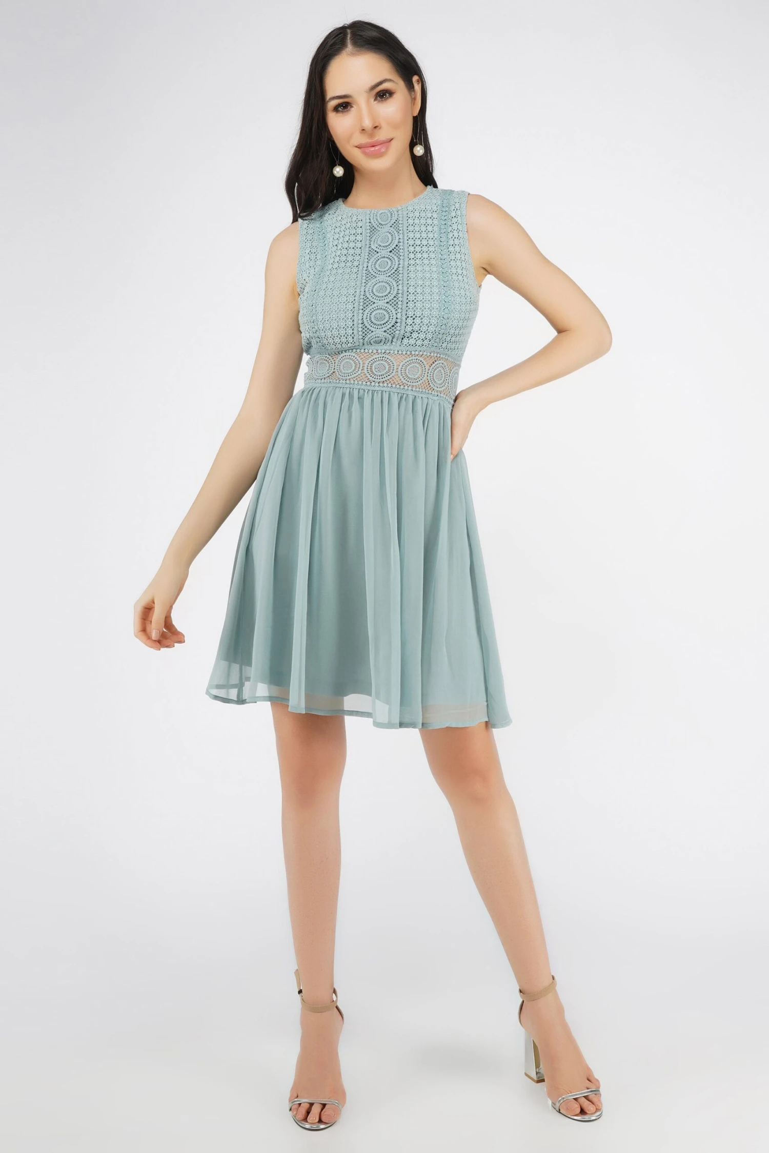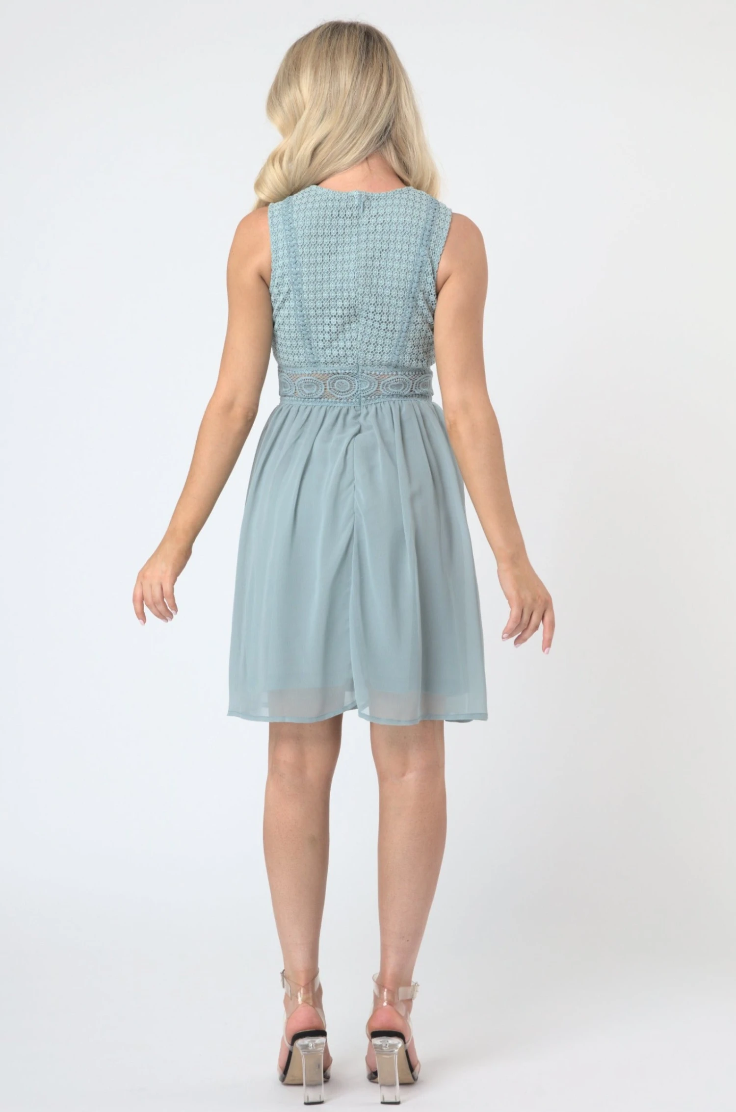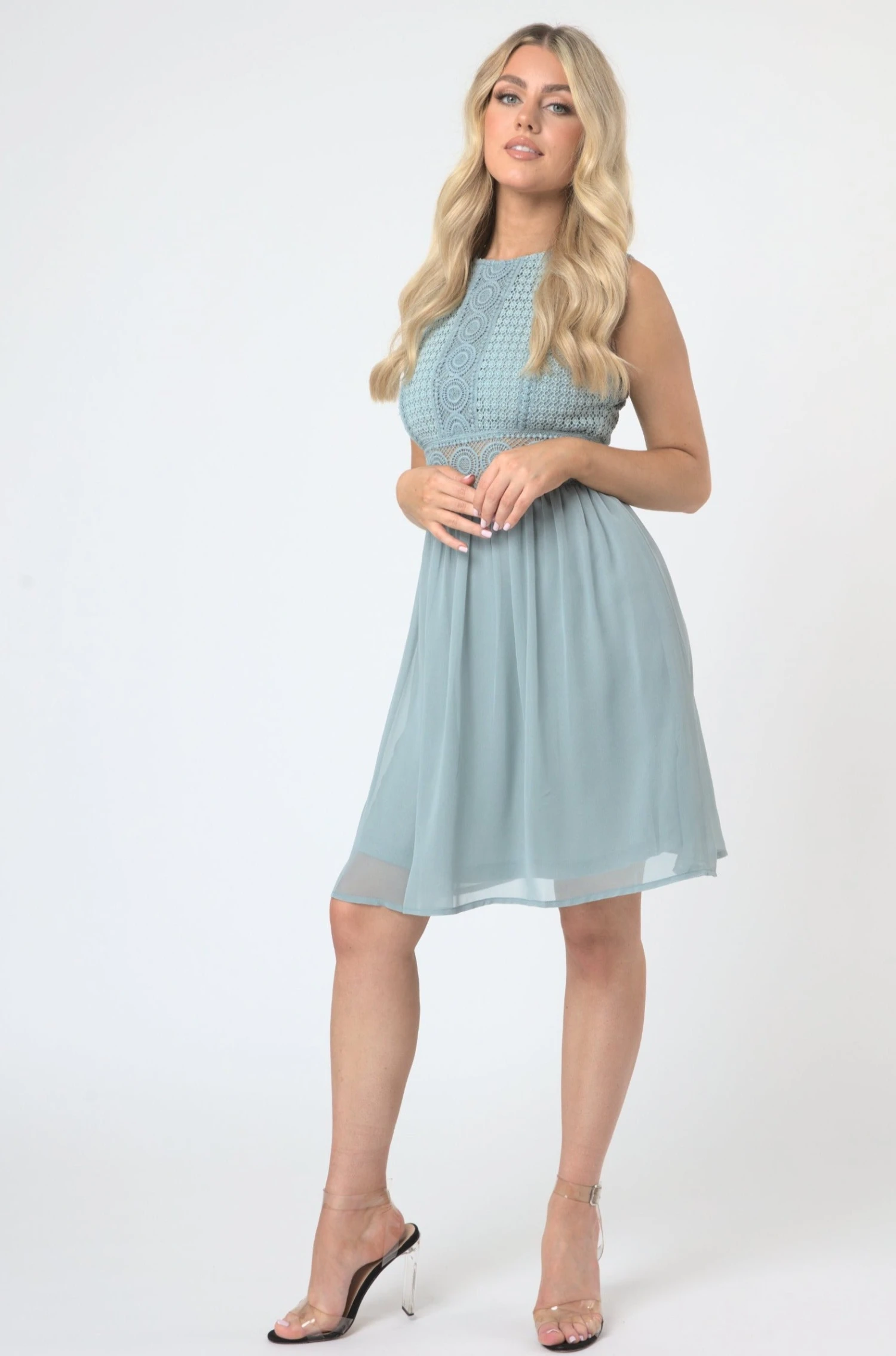 Lace & Beads Cherelle light teal skater dress. Lace embroidered top and pleated skirt. Accentuated waist with a lace belt for the ultimate flattering look. This dreamy dress is the perfect occasion dress.