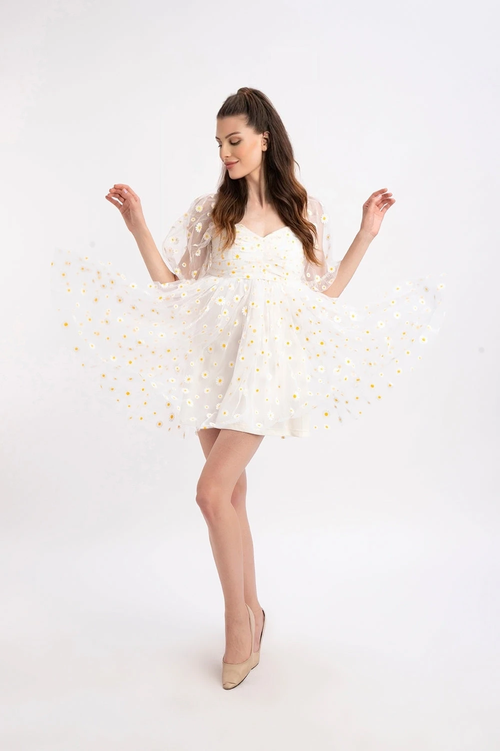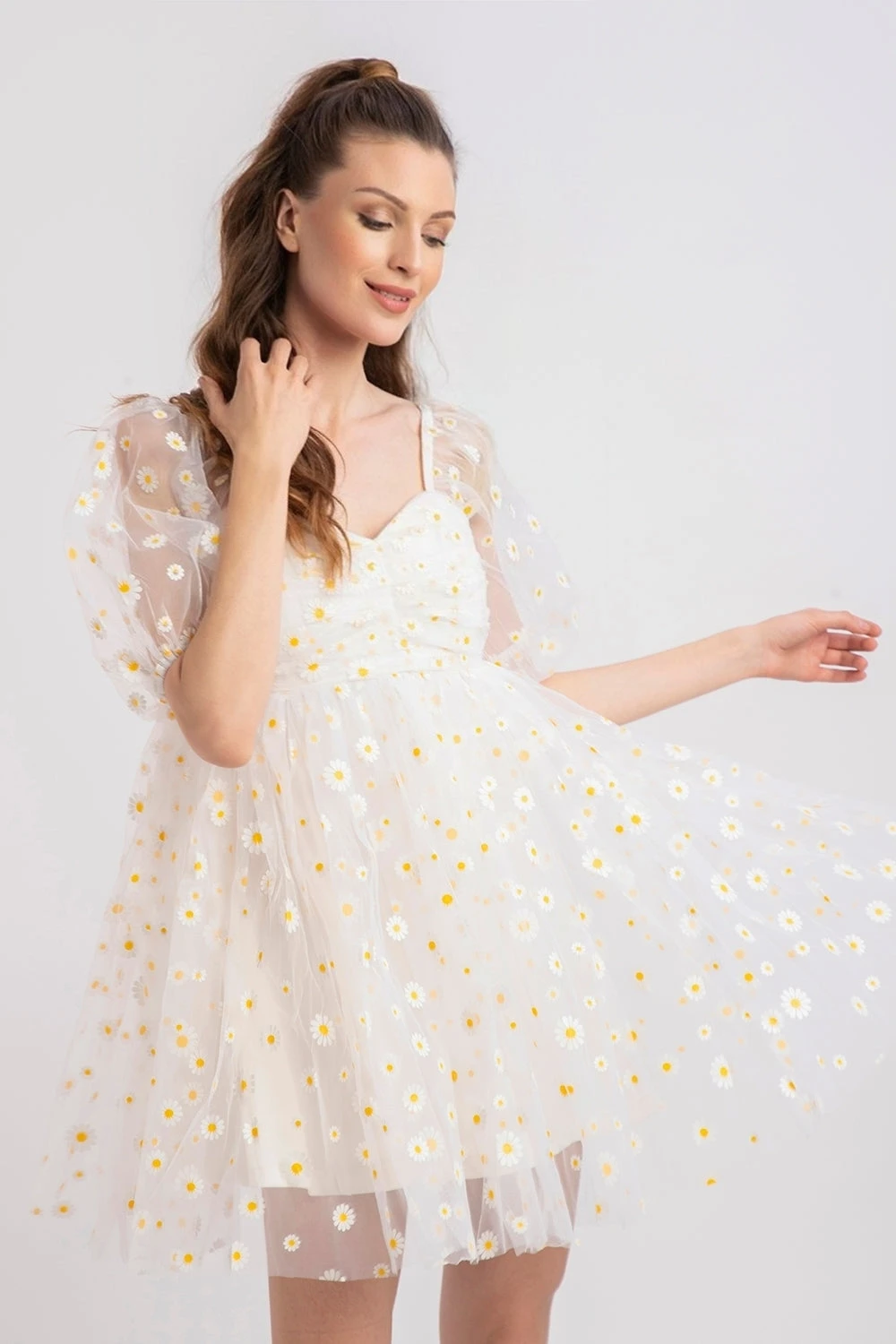 Lace & Beads Daisy tulle mini dress in daisy print. A mesh babydoll dress that features sheer tulle puff sleeves a ruched sweetheart neckline and a dainty daisy print throughout. Dreamy tulle babydoll dress with a shirred back and flowy skirt for a flattering fit. The perfect summer mini dress with its skater skirt and feminine style. Don’t miss out on adding this gorgeous romantic tulle mini dress to your wardrobe now.