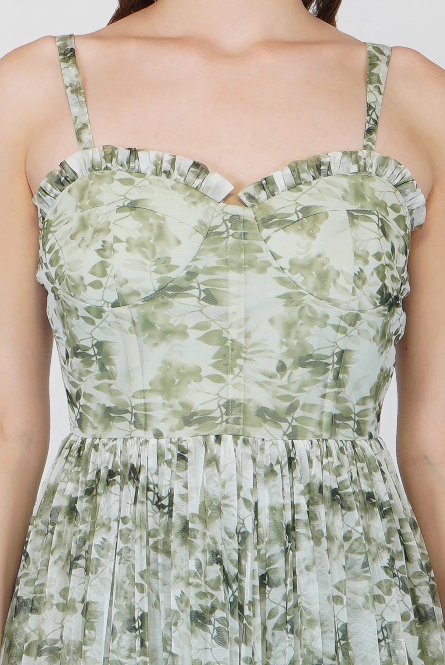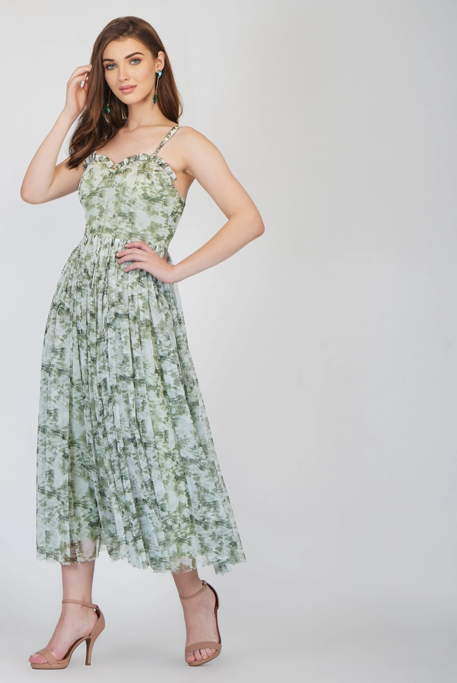 Lace & Beads Dane green printed corset midi dress. A gorgeous a-line midi dress with a tutu skirt and sweetheart neckline that has adjustable straps for a comfortable fit. This corset-style tulle dress features a beautiful green print throughout the dress. It has a trending corset style top but is finished with an elegant, feminine, flowy tulle skirt. Create a formal look with some heels as a wedding guest dress or dress it up with a leather jacket for a gorgeous night out look. This printed corset dress also looks gorgeous as a pretty tulle transitional dress a perfect addition to your Autumn wardrobe. Whether you are looking for a dress to fit your cottage-core aesthetic or just a cute Pinterest-worthy dress, this style is the perfect one for you.