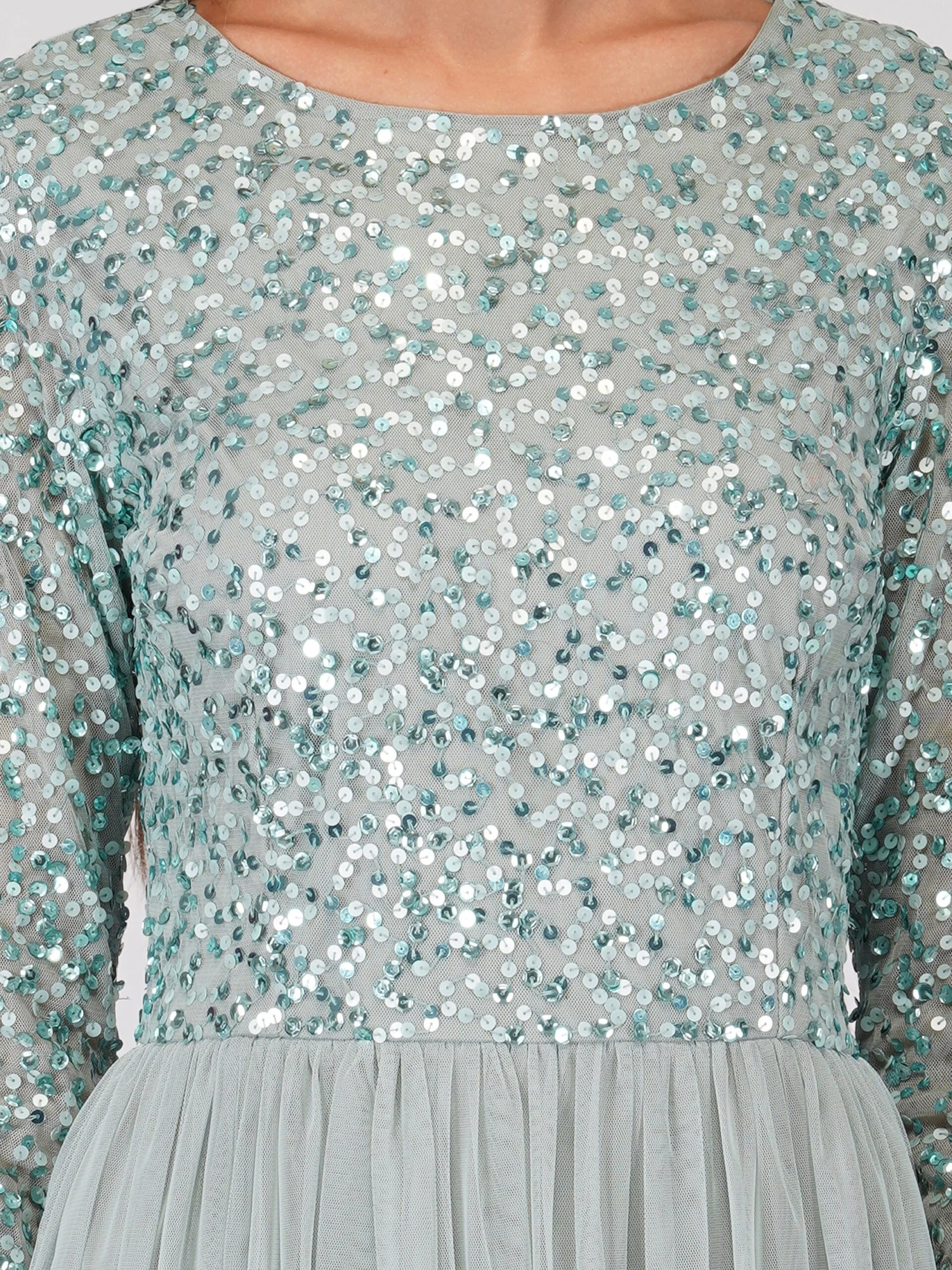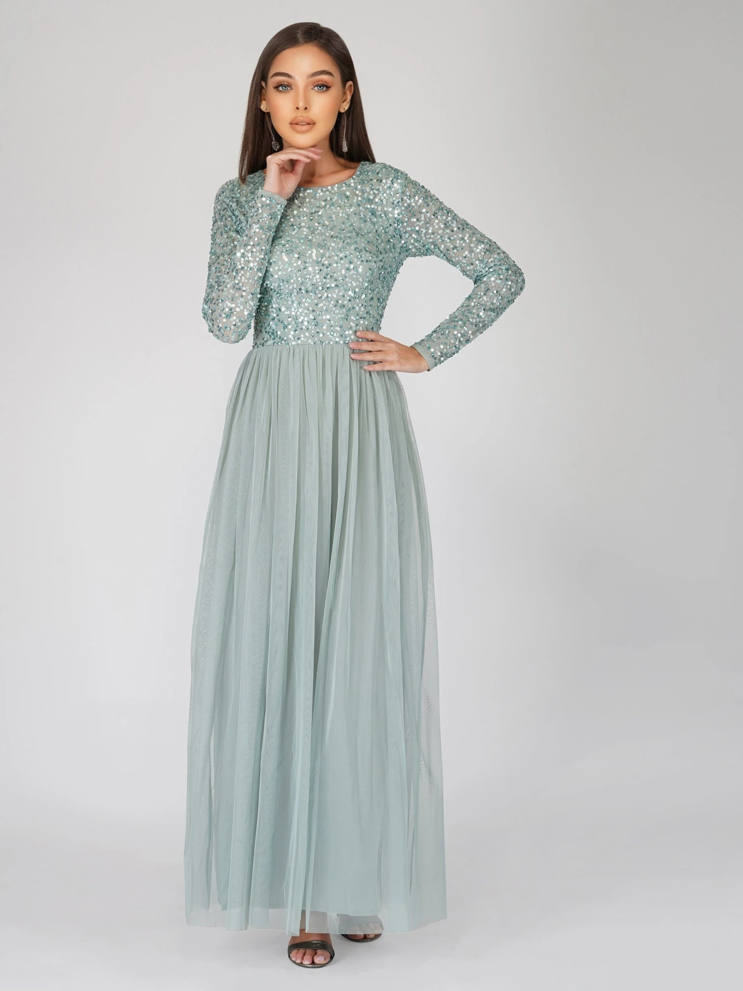 Lace & Beads Elle sage green embellished bridesmaid maxi dress. This long sleeve bridesmaid dress features a hand-embellished top that flows into an a-line tulle skirt. It is an elegant long sleeve sequin dress that you will love to wear again and again. Make an entrance with this long-sleeve-embellished maxi dress that has a sequin-embellished top with a round neckline and zip-back closure. A gorgeous option if you are looking for a modest bridesmaid dress. The sequin top and floor-length skirt combined create the perfect sage green occasion dress, whether you are looking for a teal bridesmaid dress, a long sleeve wedding guest dress, or a timeless dress for your next special occasion. Add this ethereal gown to your occasionwear wardrobe.
