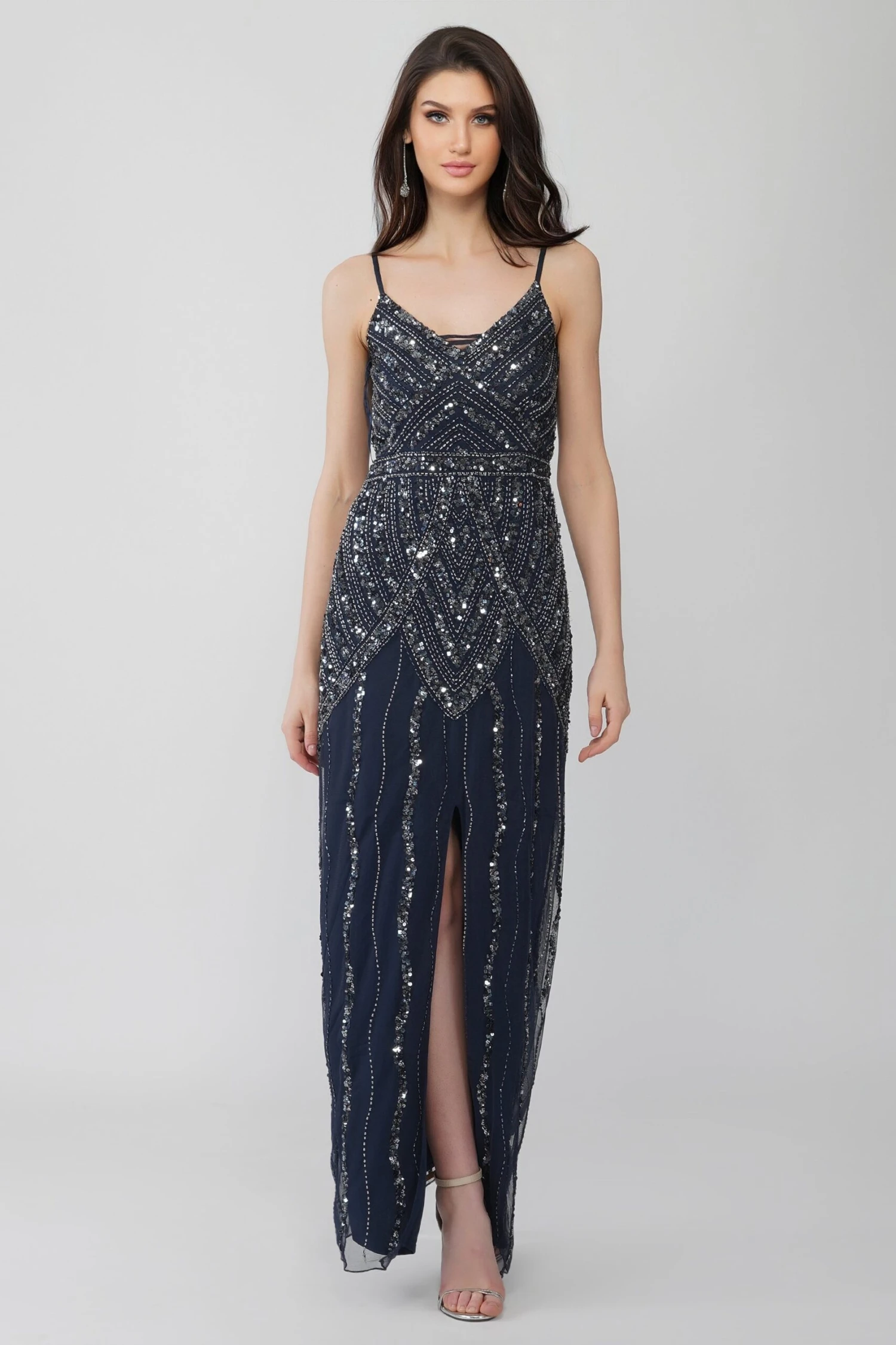 Lace & Beads Jolie dark blue sequin gown. This all-over embellished maxi dress has a slim fit that leads to a frontal slit creating an unforgettable look for any occasion. A v-neckline and delicate straps to finish this elegant gown. Make an entrance with this sensual and glamorous gown.