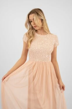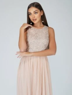 Crafted with meticulous attention to detail, the Keeva Maxi Dress showcases a beautiful mauve hue that exudes elegance and hand-embellished detailing throughout. The tulle fabric flows gracefully, creating a romantic and ethereal look that will make any bridesmaid feel like a vision of beauty.