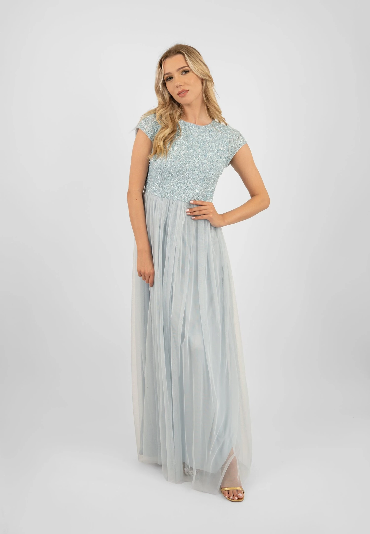 Lace & Beads Picasso capped sleeve bridesmaid maxi dress in powder blue. A short sleeve sequin embellished gown that features capped sleeves, a zip-back closure, beautiful baby blue sequins, and a floor-length tulle skirt. This powder blue bridesmaid dress is the perfect addition to your wedding.  The light blue sequins give a luxe look and the cap sleeves add a flattering finish to this embellished blue bridesmaid dress. Elevate your wedding guest look this season with this beaded powder blue sequin gown.