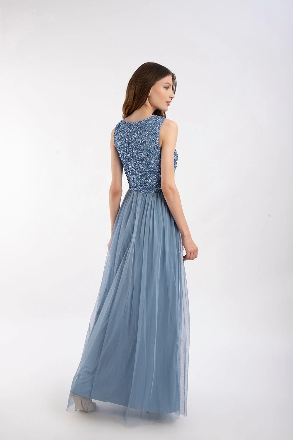 Lace & Beads Picasso V blue embellished bridesmaid dress. This dusty blue bridesmaid dress has a beautiful hand-embellished sequin top with a zip-back closure. For that upcoming wedding or gala, this special occasion gown features a v-neckline, sparkling blue beading, and a flowy-lined tulle skirt.