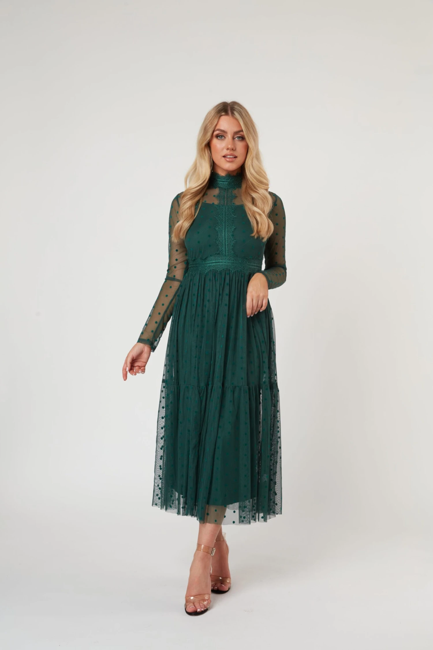 Lace & Beads Roman Lola green polka mesh midi dress. This dark green dress has a high neckline with lace detailing along the top and waist. In addition to the lace, this green tulle dress features polka dots throughout. With its flattering midi length and gorgeous lace design, this long sleeve green dress creates a beautiful look.