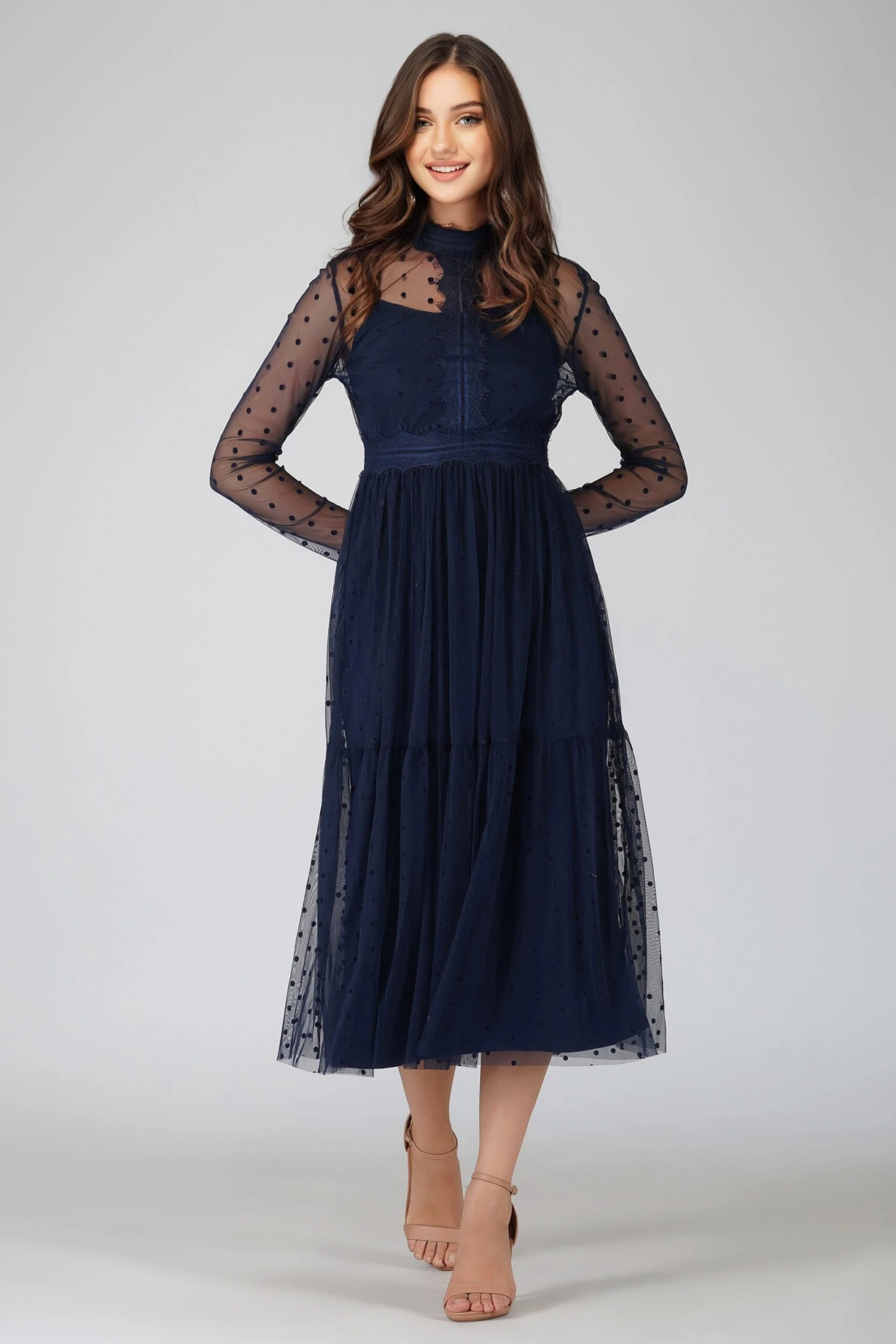 Lace & Beads Roman Lola navy blue polka mesh midi dress. A dark blue tulle midi dress that has a high neckline, long sleeves, and an included cami. This blue polka dot dress features lace detailing along the neckline and waist for a beautiful look.